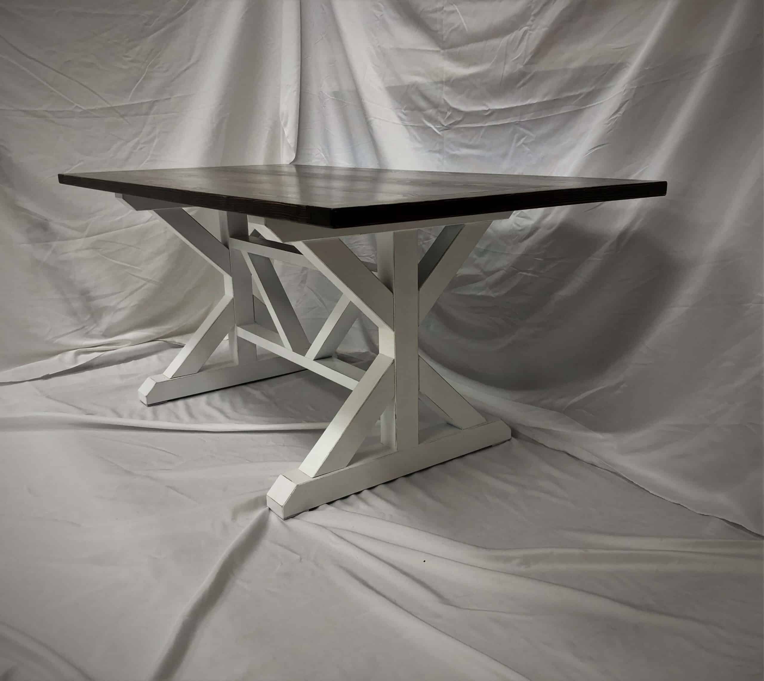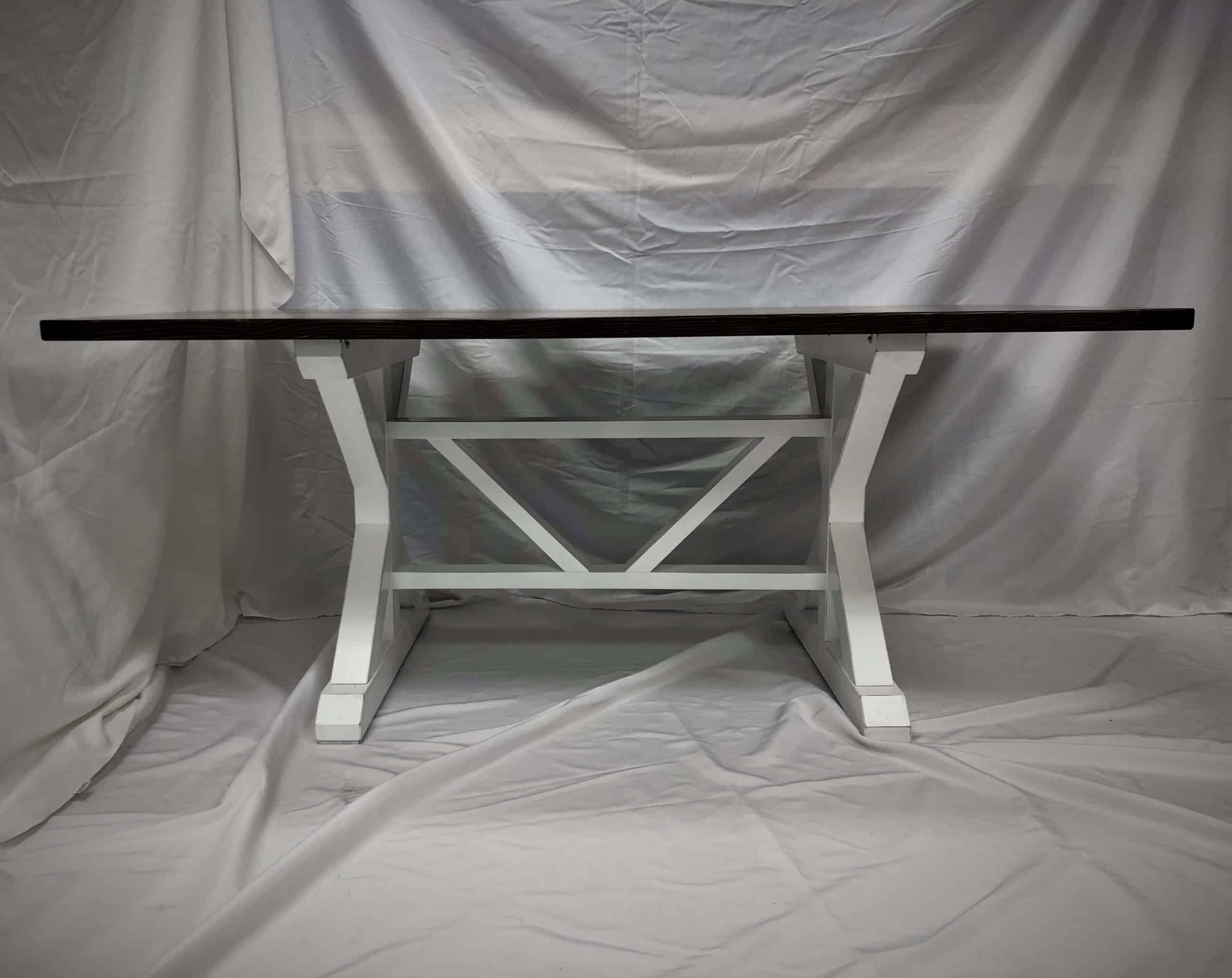 This Gibson Farmhouse Table is 72″ x 38″ x 30″ and is fashioned from Pine with an espresso finish and distressed white paint base.