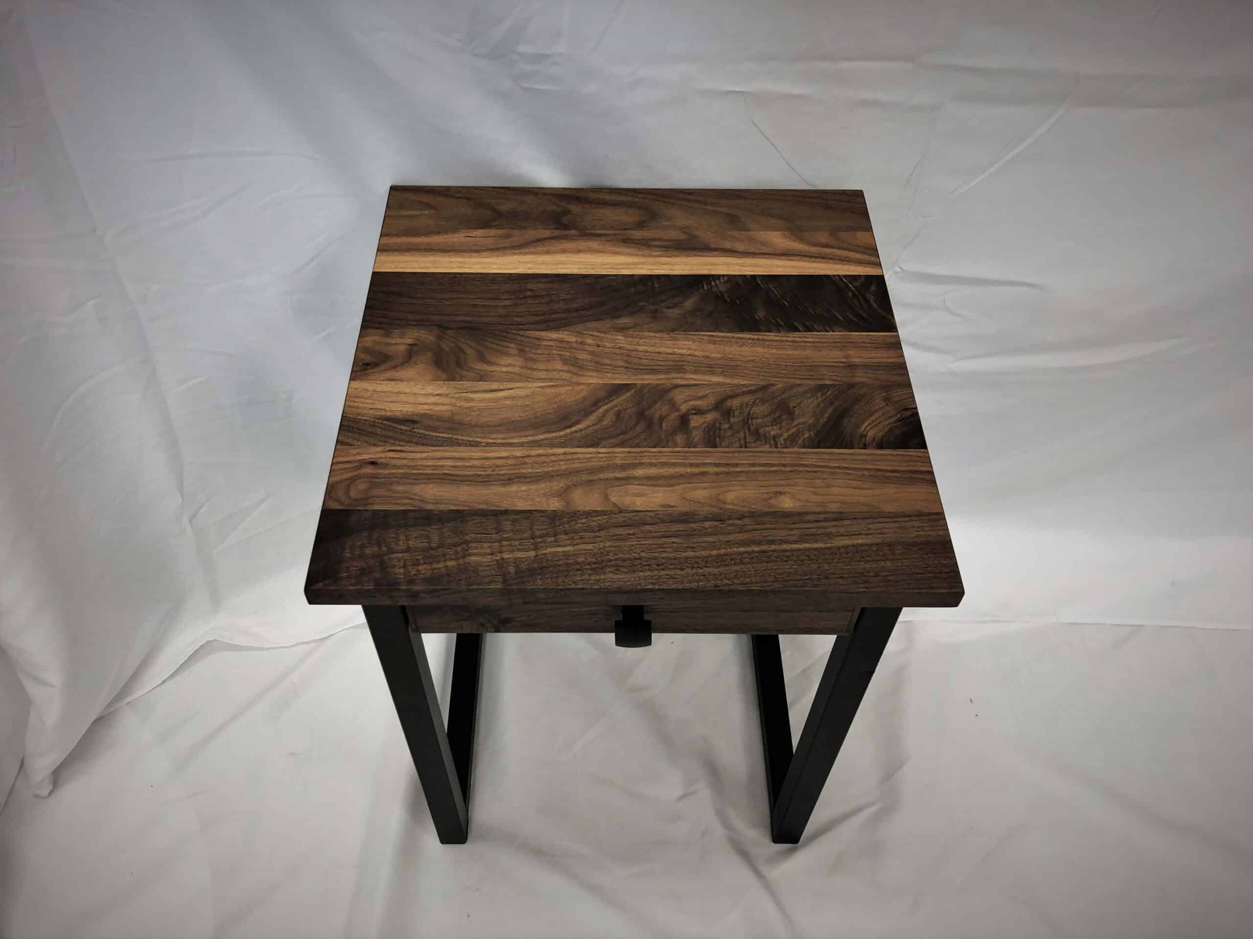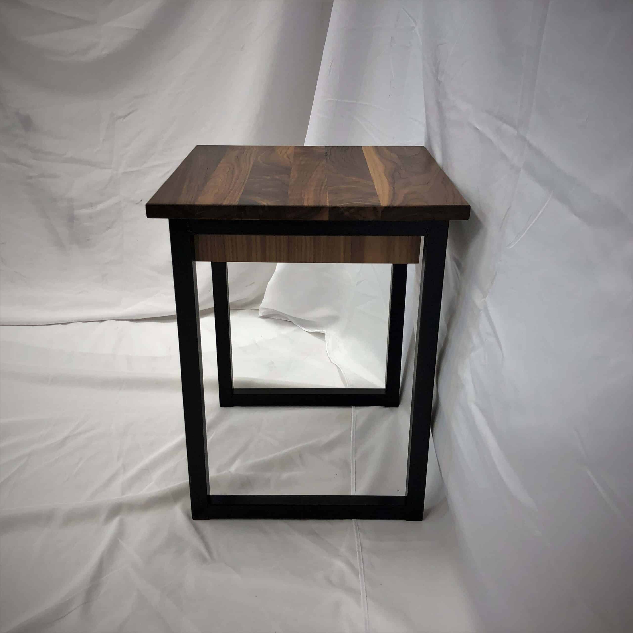 This Minimalist-Industrial Side Table is 19″ x 19″ x 24″ and is fashioned from Black Walnut with a satin clear finish and carbon steel with an oil-rubbed bronze finish.